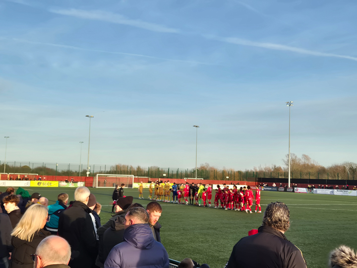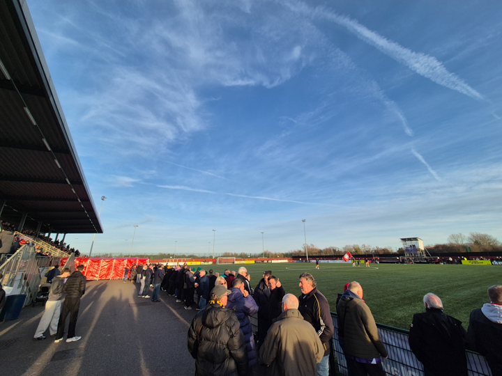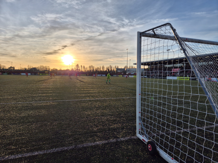 We take up positions behind the far goal and with the low sun in our eyes, it’s hard to see a lot of what’s going on. Which given the performance that unfolds, is no bad thing. As with Farnham, the “Keep it tight first 20” mantra is ignored and we weakly give away the ball on the edge of our own box and Jack Taylor makes a great saving tackle only for the ball to another red shirt and he fires it past Sims into the corner. Seven minutes. Sakes. The rest of the half is very bitty, Sims is forced into a couple of decent stops as we get caught a few times on the counter with simple direct balls in behind. Our own efforts amount to Harris shooting across goal and an otherwise anonymous Critchlow lifting the ball over an empty net when the keeper under pressure from Simper shins a clearance to him 20 yards out.