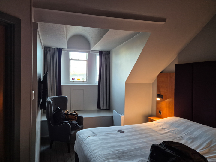 My plan of rising at shortly before 8 the following morning is scuppered by the fact I’m a bell end and set my alarm for ten to 9. Which is daft as we’re heading to the station at quarter past. Fortunately, my bladder has me up 5 mins before, so I’ve just about time to shower, pack my shit and be downstairs to meet everyone else. A Greggs breakfast baguette will have to do! Up at the station, we grab cuppas and other snacks and head for the train, however on the platform we can’t tell which way to go for our carriage so send the PI to investigate where coach G is. He gets to the next one and immediately turns back so we start heading the other way only to very soon find he’s sold us harder than Cryuff did Jan Olsson in 1974 with that turn of his and we eventually retrace our steps to find him held up by his wheely case, barely able to stand as he’s laughing so hard at the outstanding success of his little jape. We let him have his moment in the sun, with even the argumentative Greek unable to conjure up anything to remotely counter it.