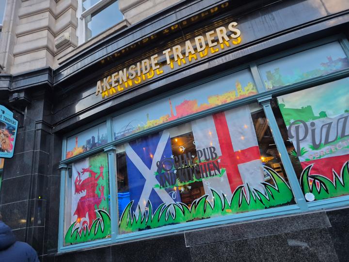We settle in and slowly sup the first livener of the day before being joined by Magnum and Mr X, the latter who announces his arrival by standing in the middle of the tiny snug we’ve bagged and farting. We mostly mumble a lot and stare at our pints although spotting the bloke on the stained glass appears to be showing us a red card does briefly amuse both in person and online. With midday upon us, we decamp to the Bridge Tavern followed by Johnny & Dan from the Yoof. Here I get more Tyneside sunshine in the eyes and spend my first pint constantly shifting in my seat to hide it behind various objects placed between me and it. Knew I should have brought my sunnies! There’s a few knocked back here before we eventually decide we should probably go get some cabs to the game, given that’s actually the excuse we’ve used to make the trip here.