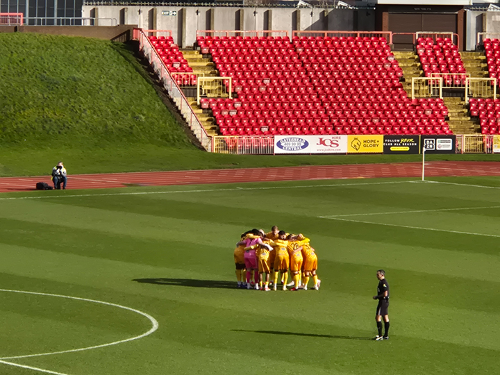 At the ground, we find the turnstiles and head in past a load of Newcastle women stuff. Upstairs, I partake of the hottest pie in the world. So much so, I have to leave it in my pocket for a good ten minutes before it’s edible. Still, I do better than 4Days who is still eating his until shortly before half time. The game? Oh yeah. That. On the pitch, the start is lively and the first 20 or so ain’t bad. We cause them some problems and Harris forces a decent save from the keeper, but we slowly fall away from here and on the half hour, we’re behind. Same old story really, too much time, too much space, slow to react and the bloke’s got all day to line it up and pick his spot from about 12 or so yards. Still, at least it’s not another fucking penalty I suppose.