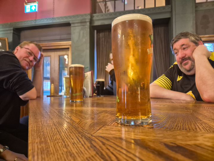 At Farnham, we walk down to town and as we do a quick unsuccessful cash stop, we’re greeted by Rax and Psycho Paul, so named by Rax as he’s decided that watching us is in some way less traumatic than fucking Spurs. So I guess we’ve got that going for us? I think that’s a positive at least, Round the corner we wander into the Tellers to find Indy nursing his expensive pint. And he’s not kidding as I buy up the next and it sets me back north of 33 quid for five beers. And for me & Rax, ours is ghastly, requiring a return to the bar to get them changed. Not cool lads, not cool. If you’re gonna demand 7 quid a pint, at least fucking pull it through before you open eh? Here we sup and discuss the shocking state of retail in the UK as well as post offices. I know, endless belly laughs and hilarity with us innit? With one done here and no one else wishing to re-mortgage, we decamp to the Borough Beer House where 4Days has just arrived himself and is parked with a pint. This gaff is much cheaper and is in a lovely old building. Here we get back onto the sometime subject of the sex party house across the road from the Welshman’s drum, mainly as Mr X has professed an appreciation of the newly renovated property immediately next door but confesses he’s not sure he could “live with those neighbours”. “Oh I dunno, maybe you’d get a locals discount?” wonders Rax.