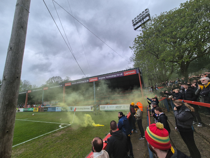 In the afters, the lad shown a yellow eventually walks when the ref realises it’s actually his second of the afternoon, before Simper steps up and puts us level. The ultras lob a yellow smoke grenade to mark the occasion. This is impressive not for the act itself, but how long it bloody burns for. Definitely got their money’s worth with that one! Right, let’s fucking crack on here lads. 2-2 and a man up. Get on it. Oh wait, never mind. Just try to fuck it up like you always do eh? Of course, a man down they make two great chances to regain the lead, first a low ball to the near post looks a certain tap in and the lad hits the post instead (no wins in 8 remember?) and then a corner causes all sorts of issues and has to be cleared off Sims line. Any hopes of going again are soon ended when Bell picks up a soft second yellow to even the teams up and the game kind of drifts from there. Although right at the death, Simper skips in wide and looks to be clearly tripped on the bye line, but the refs having none of it. Yeah, fuck off lads. What sort of shambolic outfit concedes two penalties in the same game anyway eh?? Unheard of. Oh.